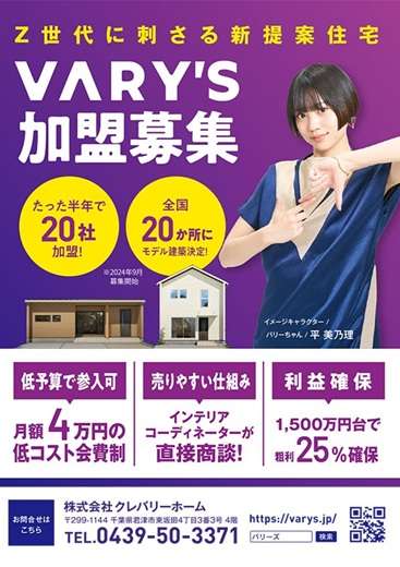 クレバリーホーム(千葉県君津市)は、Z世代に刺さる新提案住宅として、新たな住宅FCブランド「VARY’S(バリーズ)」を展開する。現在、バリーズの新規加盟店を募集している。