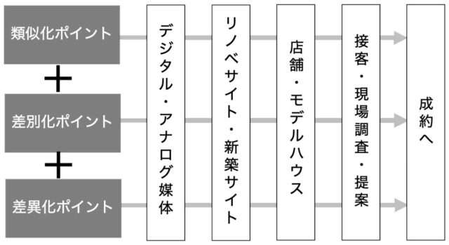 一方で「差別化ポイント」は、さらなる空間デザインの追求やよりハイレベルな性能向上という意味合いです。もちろん、これらは顧客視点においても、リフォームではないリノベーションならではの意義という観点からも可能性を探っていきたいものではありますが、同軸の競争になりがちという懸念が残ります。