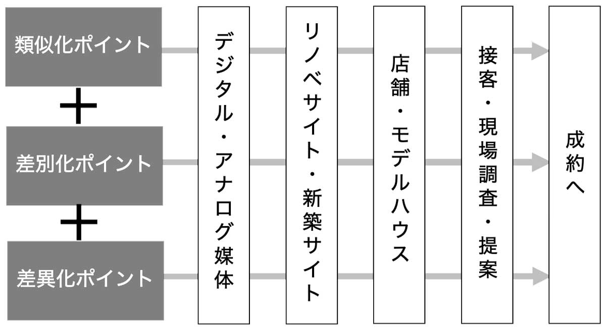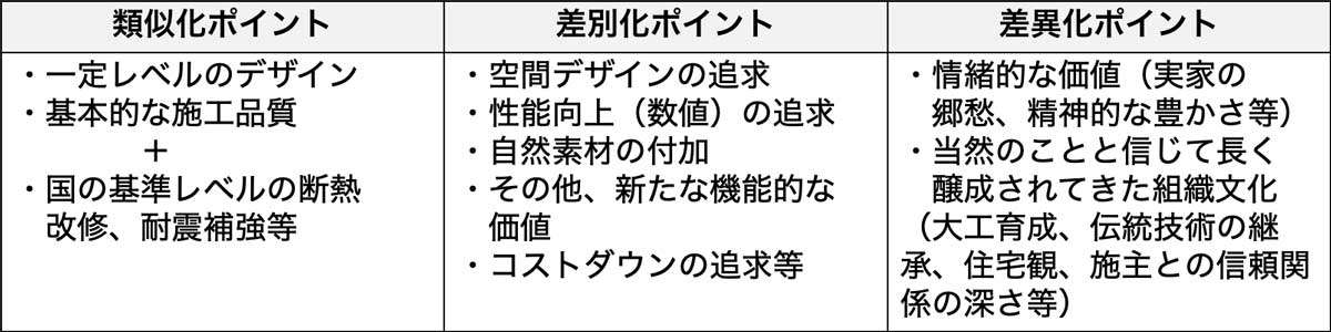「類似化ポイント」とは、競合と共通する要素、当たり前のこととして満たすべき点であるという意味です。例えば一定レベルのデザインや基本的な施工品質はどの会社にとっても当然押さえるべき要素です。中古リノベ事業ならワンストップのようなサービス面も共通しやすい要素と言えるでしょう。その他、性能向上が当たり前のものとなり、同質化しつつあるエリアが着実に増えていると実感します。