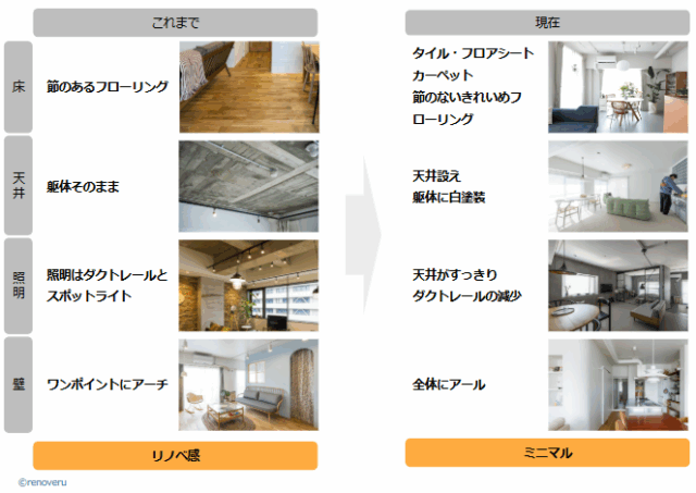 これまでのリノベーションに多かったインダストリアルや古材の無垢材といった“らしさ”から離れ、ミニマルで洗練された空間を求める傾向が強まっている。背景には、ファッション業界発の「Quiet Luxury(静かなぜいたく)」の価値観があり、装飾よりも質や佇まいを重視する感性が住まいにも波及している。