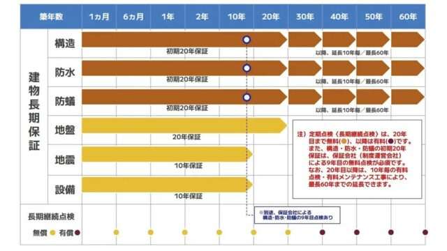 今回の拡充により、地盤を含むすべての保証期間が20年間となった。また、構造・防水・防蟻は定期点検・メンテナンスの継続により、最長で60年まで保証期間を延長することが可能になる。