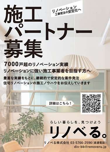 7000戸を超えるリノベーション実績を持つリノベる(東京都港区)は、中古住宅のワンストップリノベーションサービス「リノベる。」の施工パートナーを募集している。