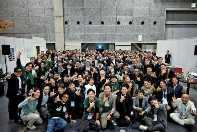 住宅・建築業界の経営者・実務者コミュニティ「釿始」の活動における一幕。住まい・建築・不動産の総合展BREX関西の会場で。最前列中央に岡本さん。マナビの過程で出会える全国の工務店仲間が「何よりも大切な財産になっている」という
