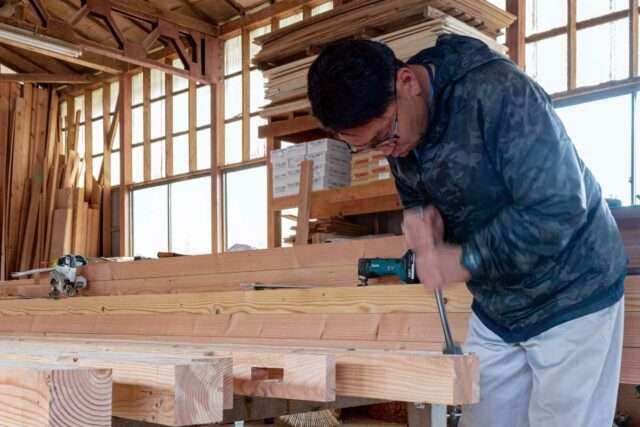 同社は、戸諸さんの曽祖父から四代にわたり続く大工の家系。神社仏閣建築で培ってきた技術を生かし、現在も大工職人による墨付け・手刻みによる家づくりを続けている。