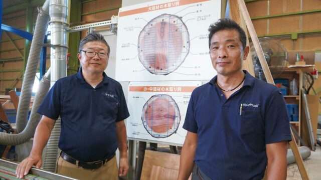 しそうの森の木専務の三渡保典さん(右)と、親会社・山弘代表の三渡眞介さん(左)。事業をけん引する兄弟で、製材と建築を一体で考える取り組みを推進する