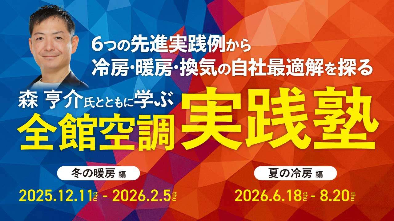 【冬の暖房編】 第1回:2025年12月11日(木) エコワークスに学ぶ【床下エアコン】全館暖房 第2回:2026年1月15日(木) 凰建設に学ぶ【蓄熱式薪ストーブ】全館暖房 第3回:2026年2月5日(木) アーク・ライフに学ぶ【パッシブ換気】全館暖房 【夏の冷房編】 第4回:2026年6月18日(木) 中日サニオンに学ぶ【Zender】全館空調 第5回:2026年7月16日(木) ラファエル設計に学ぶ【KAMI式床下・小屋裏エアコン】全館冷房 第6回:2026年8月20日(木) JIN建築工房に学ぶ【壁掛けエアコン】全館冷房 |