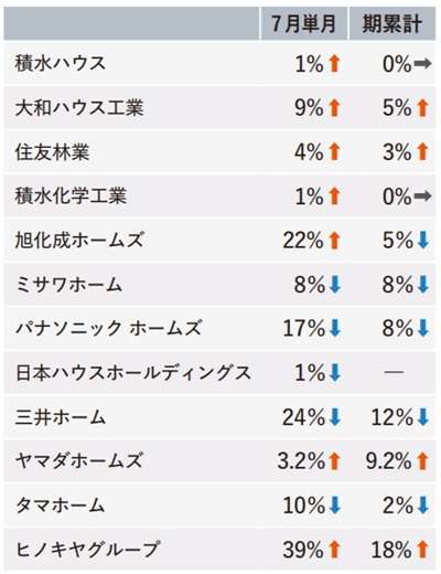 ハウスメーカー各社が8月19日までに発表した7月の戸建て注文住宅の受注速報値(旭化成ホームズは集合も含む)によると、対前年同月比で受注増となったのは先月から2社増えて7社だった。