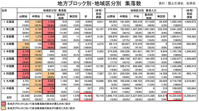 国土交通省と総務省がこのほど実施した「集落の現況把握調査」(PDF)によると、過疎地域などの条件不利地域にある集落は7万8485集落で、5年前に実施した前回調査と比べて694集落(0.9%)減少した。減少は無人化と集落再編が主な要因。特に九州圏での減少が顕著だった。