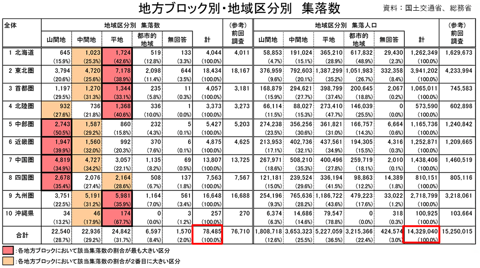 集落人口は合計1432万9040人で、1集落当たりの平均人口は約185人。2019年以降に転入者があったのは2万9889集落(43.6%)で、このうち子育て世帯の転入者があったのは1万6025集落だった。空き家の管理状況は、「一部が管理不十分」が1955集落(51.3%)、「大部分が管理不十分」が505集落(13.2%)を占めた。一方で、「概ね良好に管理」は151集落(19.9%)にとどまった。