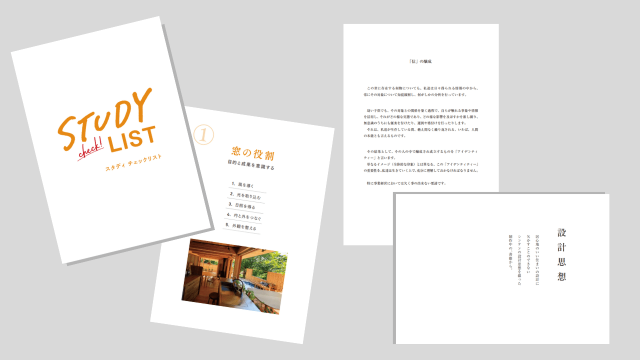 シンケンの真髄を垣間見る、貴重な資料満載! ◎シンケン設計メソッドがこれでつかめる ・シンケン設計思想エッセイ ・設計メソッドのポイントがわかるスタディチェックリスト ・STUDY HOUSE設計概要 ◎シンケンの経営思想を学ぶ資料 ・シンケンの経営理念 ・アンソロジー |