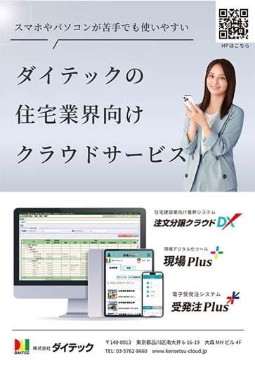 ダイテック(東京都品川区)は、注文住宅・分譲住宅の基幹業務を一元管理する「注文分譲クラウドDX」、元請・協力会社間の受発注業務をペーパレス化する「受発注Plus」、建設現場の工程・写真・図面をクラウド上で共有する「現場Plus」を開発・提供する。これらのサービスで、工務店の生産性を飛躍的に向上させ、働き方を根本から改革し、経営をより強固にする新たな可能性を切り開く。