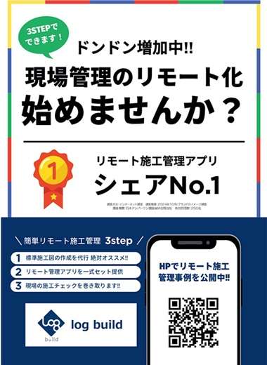 log build(ログビルド、神奈川県横浜市)が提供するリモート施工管理アプリ「Log System(ログシステム)」は、現場の施工品質管理を遠隔で代行し、すべての関係者に瞬時に共有できるリモート施工管理システム。現場監督の移動時間を大幅に削減し、完工粗利の向上、現場トラブルの防止などにも効果を発揮する。