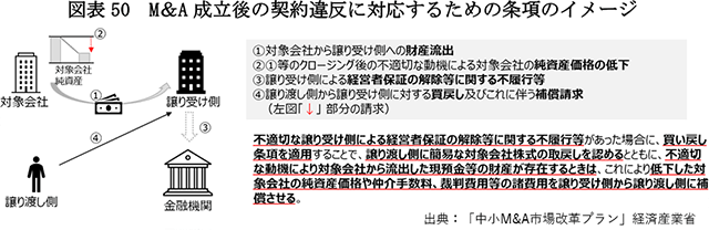 今後の施策の方向性として、譲り渡し側に係る施策では、経営者のM&A後の事業への不安感を軽減するための仕組みの確立を検討する。雇用維持や経営者保証の解除といった契約内容を担保するため、「中小M&Aガイドライン」で示す最終契約のひな形を改訂。M&A成立後に契約違反があった場合に譲り渡し側の意思で買戻しを可能とする条項を新設する。