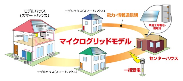 マイクログリッドは、大規模発電施設からの電力供給に頼る従来型のしくみとは異なり、小規模な地域内で太陽光発電などによる複数の分散型電源と蓄電池を組み合わせて電力を合理的に供給するしくみ。地域内の住宅や施設をITでつなぎ、地域全体でエネルギーを効率的に利用・管理する「スマートコミュニティ」を構築することで、災害に強いまちづくりを実現できる。