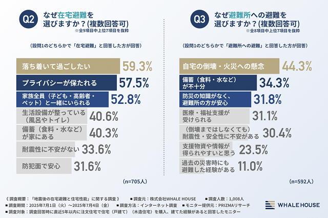 「在宅避難」の選択理由は、「落ち着いて過ごしたい(59.3%)」が最も多く、「プライバシーが保たれる(57.5%)」「家族全員(子ども・高齢者・ペット)と一緒にいられる(52.8%)」が続いた。一方、「避難所への避難」では、「自宅の倒壊・火災への懸念(44.3%)」「備蓄(食料・水など)が不十分(34.3%)」「防災知識がなく避難所の方が安心(31.8%)」が上位を占めた。