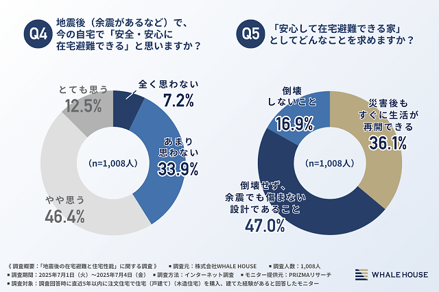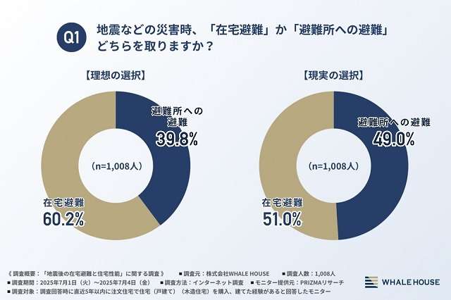 WHALE HOUSE(ホウェールハウス、兵庫県神戸市)は8月21日、直近5年以内に木造注文住宅を購入、建てた経験がある1008人を対象に実施した「地震後の在宅避難と住宅性能」に関する調査結果を発表した。災害時の避難場所について聞いたところ、60.2%が「在宅避難」を希望しているものの、現実には約半数の49.0%が「避難所」を選択すると回答。理想と現実のギャップが浮き彫りとなった。