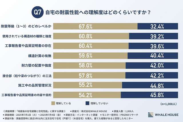 特に「耐震等級(1~3)のレベル」は67.6%が理解していると回答。そのほか、6割前後の人が「構造材の種類と強度」「工事報告書や品質証明書の存在」「構造計算の有無」「耐力壁の配置や強度」「接合部(柱や梁のつながり)の工法」について理解していた。