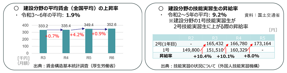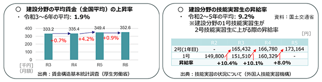 昇給について現状では、建設分野の平均賃金は2021年から2024年にかけて1.9%上昇。このうち技能実習生の昇給率(1号から2号への移行時)は、それを上回る上昇率となっている。さらに全産業の最低賃金が、同年の平均で4.2%上昇していることも考慮に入れる必要がある。
