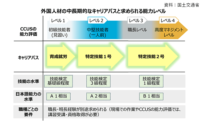 現在策定中の「キャリア育成プラン」(キャリアパス)については、CCUSの能力評価を基準として、「育成就労」はレベル1(技能検定基礎級程度)、「特定技能1号」はレベル2(同3級程度)、「特定技能2号」はレベル3以上(同1級程度)とすることを検討している。検討課題としては、「多能工化させたいというニーズが根強い」といった意見や、「日本語教育を企業側で実施することが難しい」「家族の帯同、生活基盤の整備、地域社会の共生の観点が必要」などの指摘も出ている。