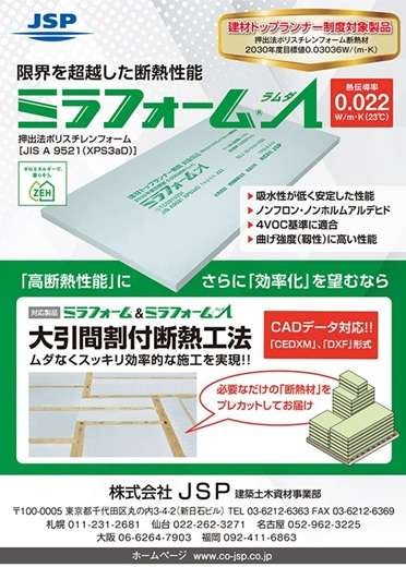 押出法ポリスチレンフォームによる高性能断熱材を全国展開するJSP(建築土木資材事業部、東京都千代田区)は、必要なだけの断熱材をプレカットして現場に届けることで、ゴミ削減と工期短縮に大きな効果を発揮する断熱工法「大引間割付断熱工法」を全国の工務店に向け提案する。
