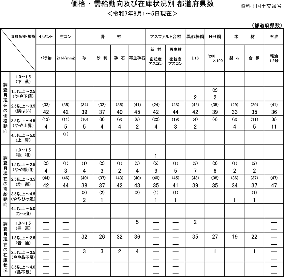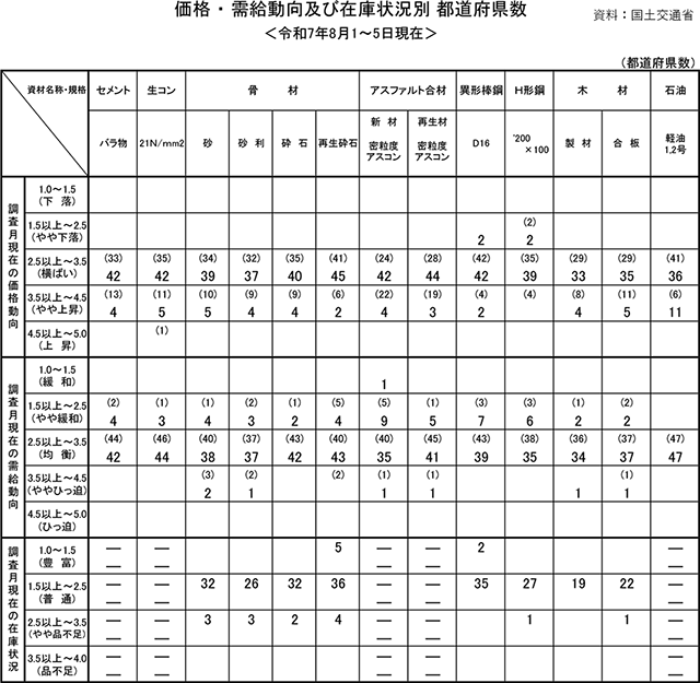 国土交通省が8月25日発表した「主要建設資材需給・価格動向調査結果」(8月1~5日に実施)によると、価格動向はすべての資材で「横ばい」となった。需給動向はすべての資材で「均衡」、在庫状況はすべての資材で「普通」となり、いずれも前月から大きな変動は見られなかった。