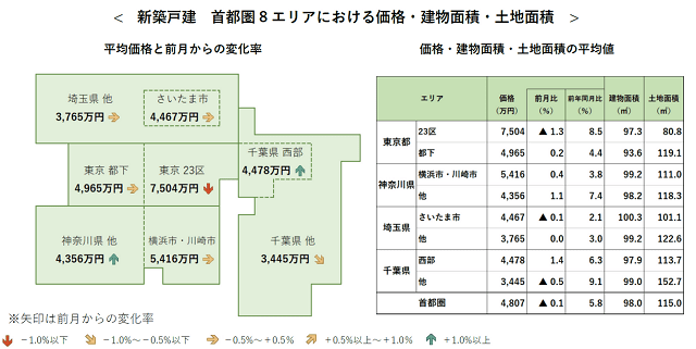 首都圏全体の平均価格は前月比0.1%減の4807万円と6カ月ぶりに下落した。東京都下、神奈川県(横浜市・川崎市/他)、千葉県西部の4エリアでは2017年1月以降最高額を更新した。前年同月比は5.8%増と11カ月連続で上昇し、全8エリアで4カ月連続前年同月を上回った。