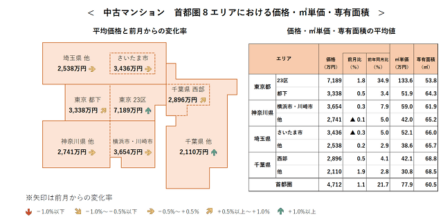 首都圏全体の1戸あたりの平均価格は、前月比1.1%増の4712万円と12カ月連続で上昇。神奈川県他、さいたま市を除く6エリアが前月比プラスとなり、東京都(23区/都下)、横浜市・川崎市、千葉県他の4エリアで2017年1月以降最高額を更新した。前年同月比は21.7%増と12カ月連続で上昇し、全8エリアで3カ月連続前年同月を上回った。