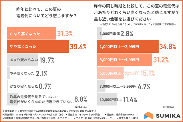 昨年と比べて、2025年夏の電気代についてどのように感じるか聞いたところ、約7割が「高くなった」(かなり高くなった31.3%・やや高くなった39.4%)と回答。昨年と使用量が変わらなくても、電気料金体系の変動や補助終了による影響、再エネ賦課金の増加などで、多くの人が「電気代の上昇」を実感していた。「安くなった」層が少ないことからも、節電の効果が得られていないことがわかる。