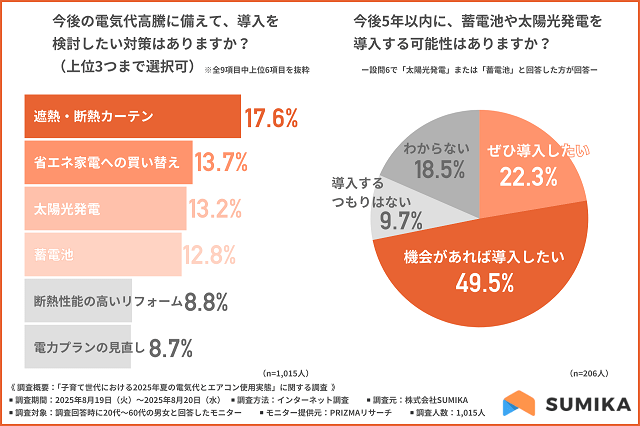 今後の電気代対策について聞いたところ、「特にない(52.1%)」が過半数を占めたが、上位に「遮熱・断熱カーテン」(17.6%)、「省エネ家電への買い替え」(13.7%)、「太陽光発電」(13.2%)、「蓄電池」(12.8%)が上がった。断熱リフォームは8.8%だったが、電気代のさらなる高騰や補助制度の普及によって、断熱リフォームへの意識が変化していく可能性があると同調査は指摘している。
