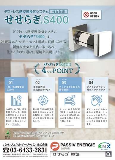 パッシブエネルギージャパン(東京都品川区)は、業界最大値・熱交換率93%のダクトレス熱交換換気システム「せせらぎS400」を販売する。
