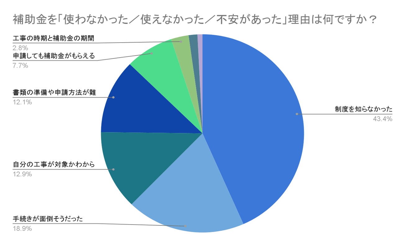 補助金を利用しなかった理由としては「制度を知らなかった」が43.4%で最多、次いで「手続きが面倒そう」18.9%、「対象になるかわからない」12.9%と続き、認知不足が大きな障壁となっている([グラフ2])。
