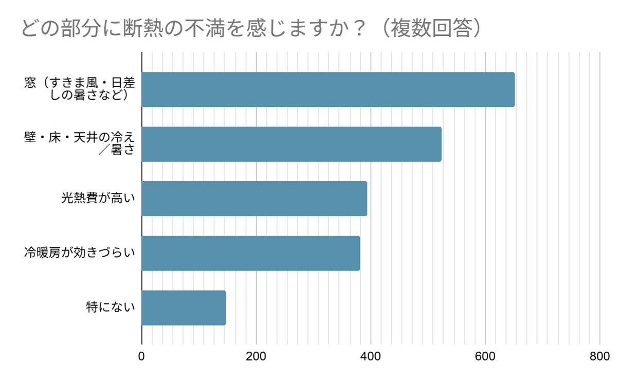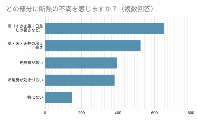 住まいの不満としては、4人に3人以上が断熱性に不満を感じており、特に窓のすきま風や日差しによる暑さ・寒さ、壁や床・天井の冷暖房の効きの悪さ、高い光熱費への不満が目立った。これらはいずれも補助金対象工事で対応可能であるにもかかわらず、情報不足により活用が進んでいない。
