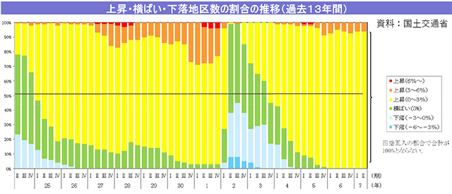 このうち住宅地は22地区すべてで上昇したが、変動率区分に変化はなかった。「福岡県大濠」も引き続き「上昇(3~6%)」の高い上昇率を維持した。商業地も58地区のすべてで上昇。「中野区中野駅周辺」では、変動率区分が「上昇(0~3%)」から「上昇(3~6%)」に移行。「横浜市みなとみらい」は上昇率が鈍化し、変動率区分が「上昇(3~6%)」から「上昇(0~3%)」に移行している。