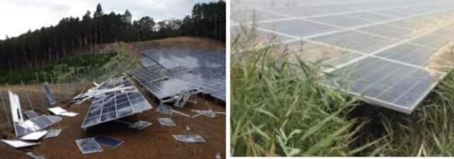 左:台風時の強風により破損した事例(出典:「電力安全小委員会の各ワーキンググループにおける検討事項等について」経済産業省 第22回産業構造審議会 保安・消費生活用製品安全分科会 電力安全小委員会)