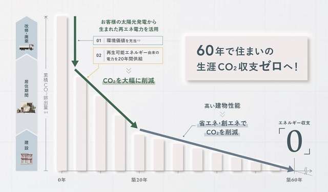 「earth-tect」では、建設~運用~改修~解体(廃棄)までの累積CO2排出量を、HEBEL HAUS由来の環境価値を用いてエンボディドカーボンに充当する考えを採用。顧客の屋根に設置した太陽光で得られた非化石証明書を活用するほか、ヘーベル電気を通じて買い取った実質再エネ電力を20年間供給することでオペレーショナルカーボンを削減する。