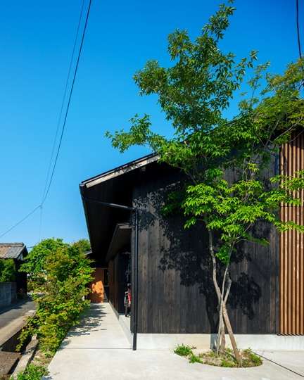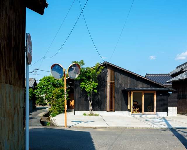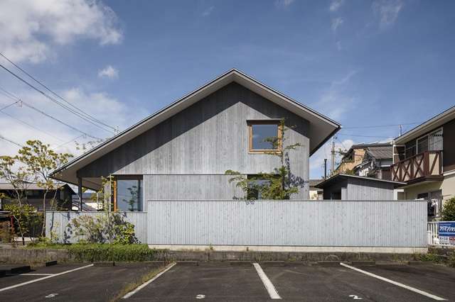 また下の住まいは杉板黒色保護塗料仕上げの外壁に切り妻屋根という、ある種重厚な趣の外観ですが、大きなボリュームを分節するように縦長の格子のスリット窓が設けられ、さらに部屋の一部が出窓のように突出して設けられています。こうした要素がアクセントになることで、重厚さに柔らかさと親しみやすさが見事に加味されています。