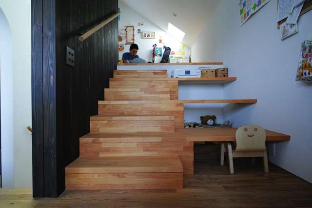 下の住まいは名前のとおり、スキップフロアやお伽の国のような階段室などを備えた、たいへん立体的で楽しい住まいです。