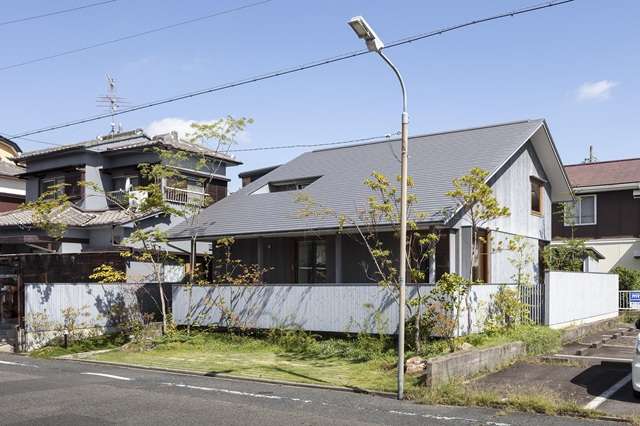下の住まいでは前面道路に対して妻側でなく平側(けらばの側)を正面に向けています。そして軒をうんと深く出し、その下に囲われた半屋外のテラスを設けています。こうしたしつらえが外観への良きアクセントとなって、切り妻屋根の大屋根感を強調しています。