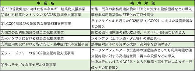 「業務用施設における省CO2化・熱中症対策等支援事業」(表⑥)では、クーリングシェルター(指定暑熱避難施設)の普及を図るため、既存建築物への高効率空調の導入費用などを支援する。募集要件は、市町村長から指定暑熱避難施設の指定を受けること、事業実施前と比較して施設全体で省CO2化されていることなど。補助対象は、必要な工事費のうち補助事業者が承認した経費で、上限額は1000万円となっている。