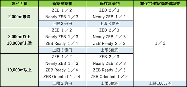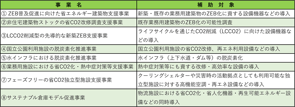 「ZEB普及促進に向けた省エネルギー建築物支援事業」(表①②)では、新築・既存の業務用建築物のZEB化を対象に、省CO2改修に関する調査や設備機器導入などを支援。調査にかかる費用や必要な工事費(本工事費、附帯工事費、機械器具費、測量・試験費)などの経費について、4分の1~3分の2の範囲で補助を行う。なお、建築物木材利用促進協定に基づいて木材を用いる事業や、CLTなど新たな木質部材を用いる事業については、優先採択枠を設ける。