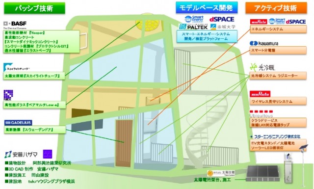 今回の「スマートセルプロジェクト」では、住民を元気にする環境、文化、食、健康、低エネルギー負荷+循環型のコミュニティモデルを追究する場としてモデルハウス「スマートセル」の建築を構想。賛同企業17社が参画して、資金、建築資材、機器などを持ち寄り、2階建て・約60m2のメイン棟を建設した。パッシブ技術とアクティブ技術を融合し、分散電源と系統電源が協調するエネルギーシステムを実現している。