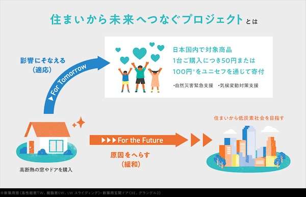 住宅の高断熱化・冷暖房使用抑制につながる対象商品1台購入につき50円または100円を、ユニセフを通じて気候変動による影響を受ける国・地域の子どもたちの支援に寄付するもので、2023年に開始し今回で3回目。