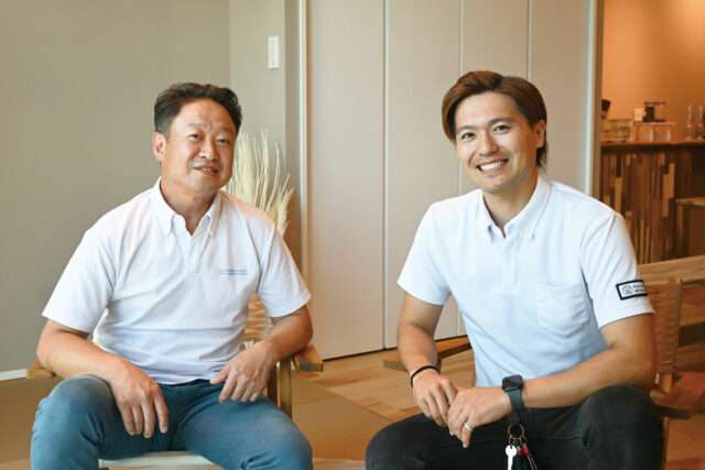 五十嵐建築の五十嵐匠常務(右)と加藤建築の加藤正勝代表。五十嵐さんは、加藤さんが手がけた“魔法のエアコン”導入の住宅の圧倒的な快適性に衝撃を受け、「自社でも導入させてほしい」と加藤さんに熱望。加藤さんが快く応じてコラボが実現した