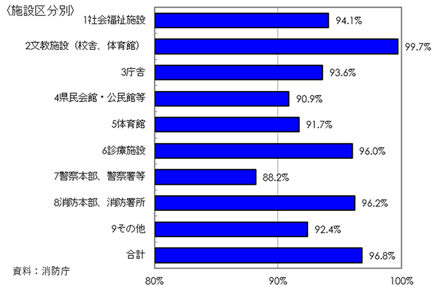 防災拠点施設の耐震化率を用途別に見ると、「文教施設(校舎・体育館)」が99.7%で最も高かった。未改修・未確認の施設は297棟。同施設は避難所として指定される割合も高いことから、耐震化が進んでいる。一方、災害対応を担う「警察本部・警察署」の耐震化率は88.2%(未耐震693棟)、「消防本部・消防署」は96.2%(同209棟)だった。