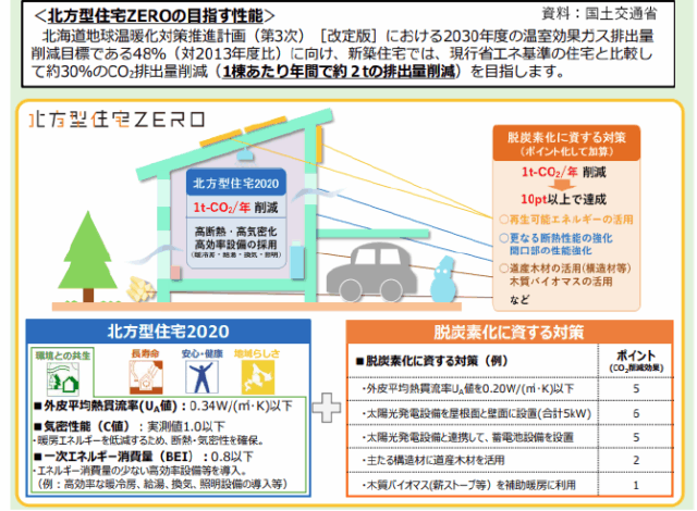北海道ビルダーズ協会の「北方型住宅ZERO【長期優良住宅】~道内普及・啓発推進事業」では、道独自に設定した住宅性能基準の住宅を建設。住宅履歴情報を活用することで長期的な維持管理に対応した質の高い住宅供給を目指す。脱炭素化対策をポイント化することで、効果の見える化を図る。