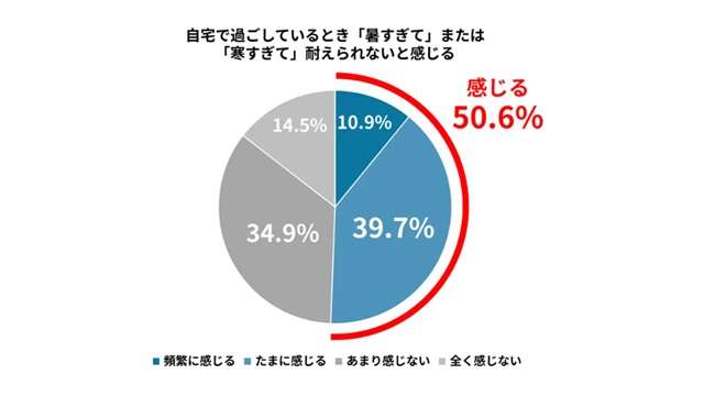 東京都はこのほど、全国の戸建てまたは集合住宅(分譲)に住む20~80代の男女1400人を対象に実施した「住まいの室温に関する実態調査」の結果を発表した。それによると、「室内が暑すぎて/寒すぎて耐えられないと感じる(頻繁に感じる10.9%・たまに感じる39.7%)」が50.6%と、持ち家に住む人の約半数が室内の暑さ/寒さを耐え難く感じていることがわかった(グラフ下)。