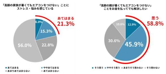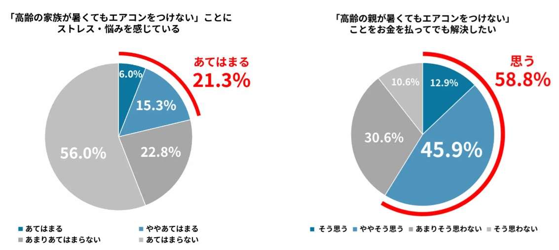 高齢の親と同居している人は、約2割が「高齢の家族が暑くてもエアコンをつけない」ことにストレス・悩みを感じていると回答。そのうち約6割(58.8%)がお金を支払っても解決したいと考えており、支払える月額平均は4116円だった(グラフ下)。