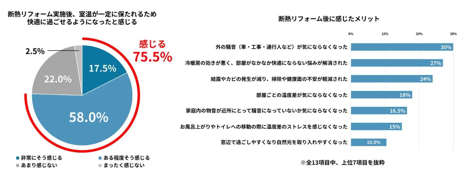 一方で、断熱リフォーム実施者の約8割が、リフォーム後に「室温が一定に保たれるため、快適に過ごせるようになった(75.5%)」と感じており、光熱費が平均3479.6円/月減少していることがわかった。また、断熱リフォーム後は、「外の騒音(車・工事・通行人など)が気にならなくなった(30.0%)」、「結露やカビの発生が減り、掃除や健康面の不安が軽減された(24.0%)」など、室温以外のメリットも感じていた(グラフ下)。