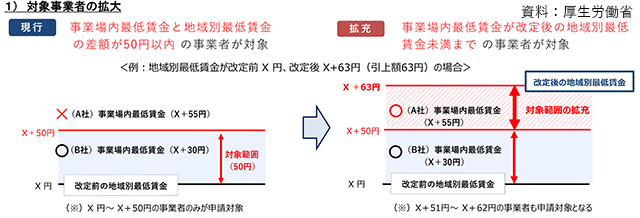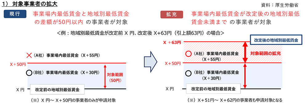 助成金の対象については、これまで「地域別最低賃金との差額が50円以内」の事業所に限られていたが、「改定後の地域別最低賃金額未満」の事業者まで対象が広がった。例えば、改定前の最低賃金が1100円で、63円引き上げられる地域だった場合、改定後の新しい最低賃金は1163円となることから、自社の最低時給が1100円~1162円の事業者が対象となる。