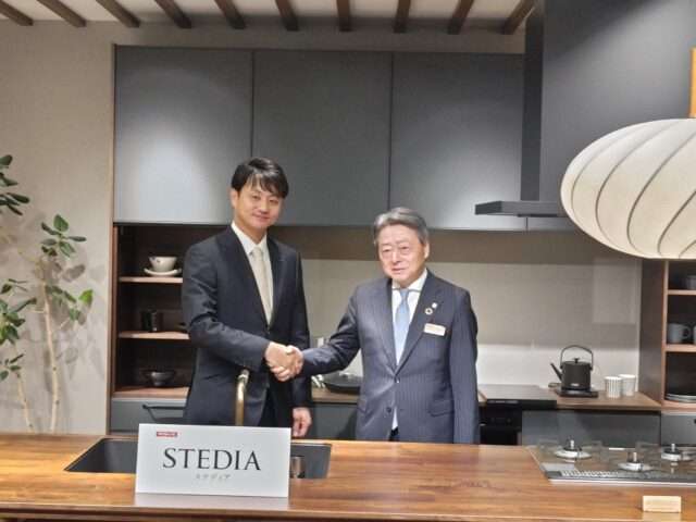 クリナップ社長・竹内宏さん(右)、朝日ウッドテック社長・海堀直樹さん(左)